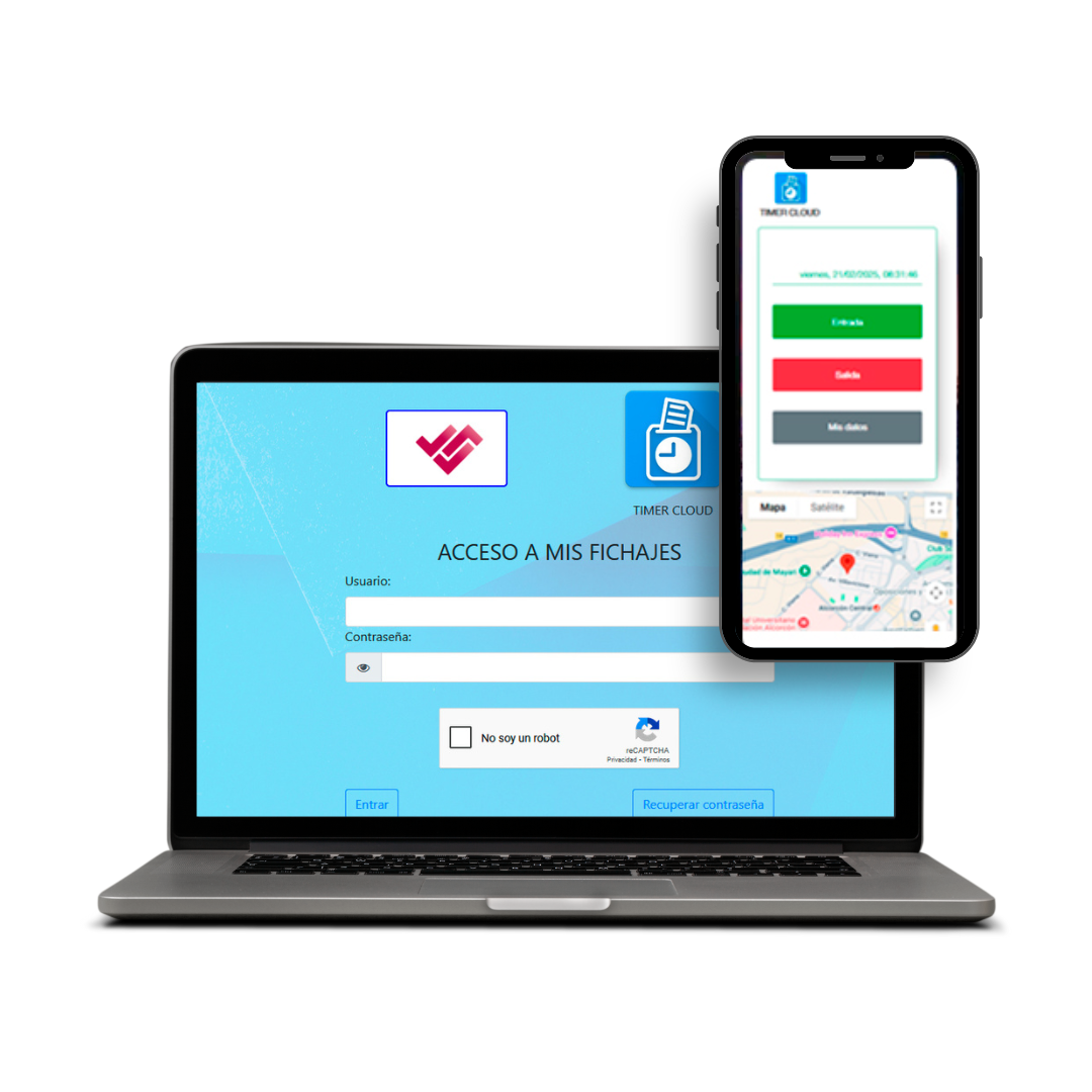Timer Cloud permite el fichaje y validación de jornadas desde múltiples dispositivos a través de la app, enlace web o plataforma de escritorio.